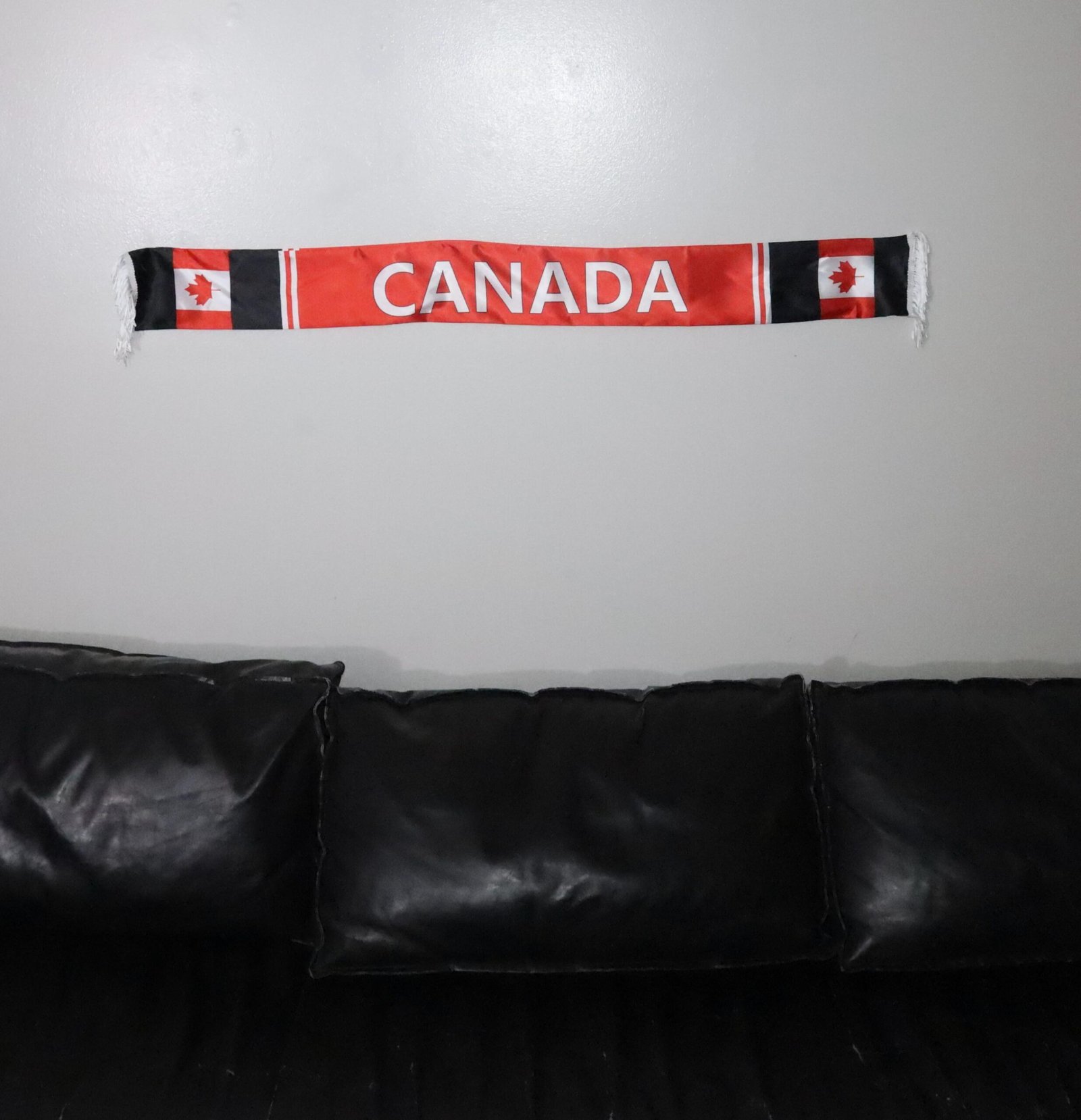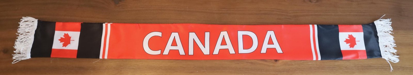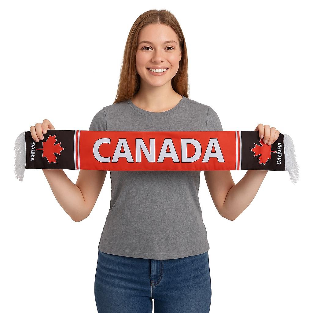 PATRIOTIC DESIGN: Canada flag-themed scarf featuring iconic red and white, with Maple Leaf logo pattern and bold ‘CANADA’ text display